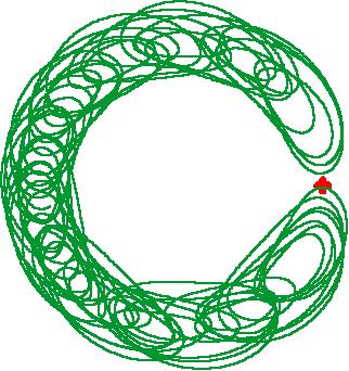 Libration diagram: Motion of the angle s in polar coordinates in the next 690 years. The distance from the center is the eccentricity and the polar angle is s. There are two episodes of libration separated by a little more than one century of retrograde circulation around t=2400.