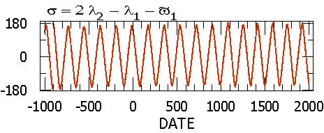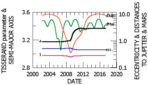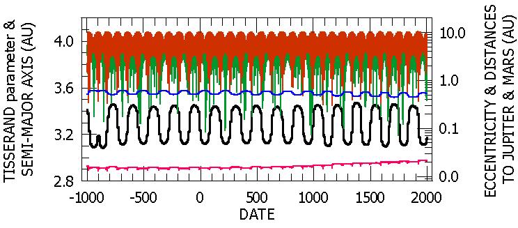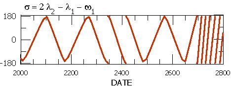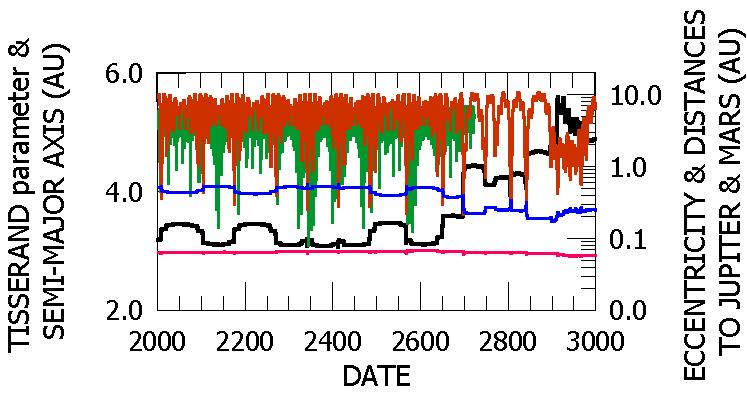 While s is far from 180 deg, the asteroid cannot approach Jupiter; however at every half libration period, s approaches 180 deg, and at those dates a close approach to Jupiter becomes possible. The libration period is close to 175 yrs, and we may count 8 approaches in the next 600 years, most of them below 0.3 AU and the last of them close to 0.2 AU. The motion lies at the border of the 2/1 resonance and the above libration diagram shows that at each half libration period, the motion approaches a saddle point and is chaotic. As a consequence the actual evolution after some approaches is unpredictable. In several runs before the one shown above, the behavior was only "almost" the same. Always the closest approximation to Jupiter occurs in 500 to 700 years, with values that may be even much closer that the one shown above. The transition shown after year 2700 was seen in every simulation, always showing a large increase in the semi-major axis.